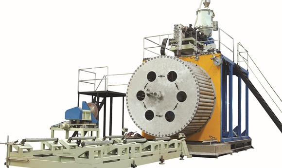 This pipe extrusion line include : extruder, die head, molds, spiral forming machine, forming molds, glue extruder, vacuum calibrating system, water spraying tank, cutting machine, overturning bracket and the whole line controlling system.